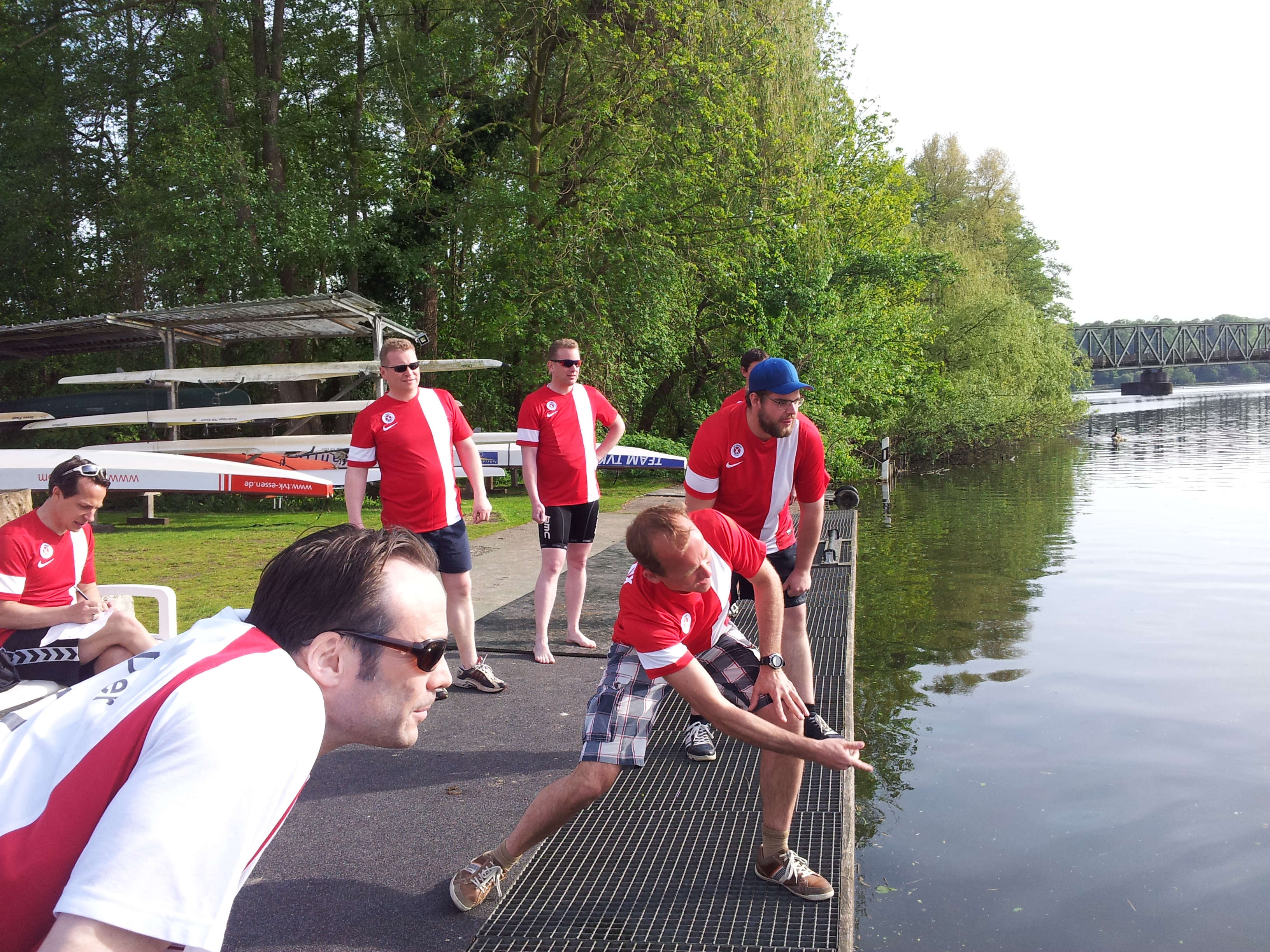 Entgegen dem Teammotto "Wer trainiert, der kann nix" wollte der Vizemeister Düsseldorf der Schande entgehen, bei den kommenden 12-Kampf-Spielen in Lübeck im Drachenboot zu kentern. Folgerichtig stand im Mai also Drachenbootrennen an.